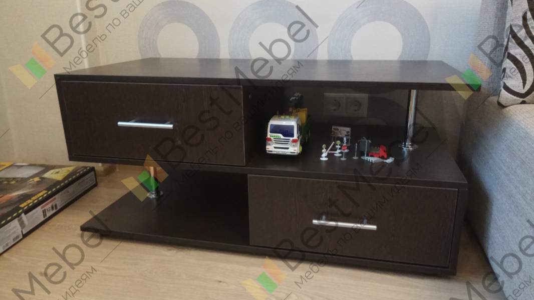 Заказывала в цвете венге, с кромками 2мм в стандартном размере. Все детали ровные, без сколов, кромки приклеены ровно. Ящики глубокие, направляющие заказала обычные, но они гладко и негромко закрываются. Ножки классные: толстые пластмассовые цилиндры высотой около 2см.За счет открытых полок выглядит легким, но стол тяжелый, больше как тумба, а не журнальный стол. Лучший вариант за свою цену.Один нюанс - к каждой детали приклеены наклейки с параметрами, это очень упрощает сборку - это плюс. Но наклейки очень трудно оторвать, клей сложно отмыть. На темном - не видно, а вот если белый заказать, могут следы остаться.