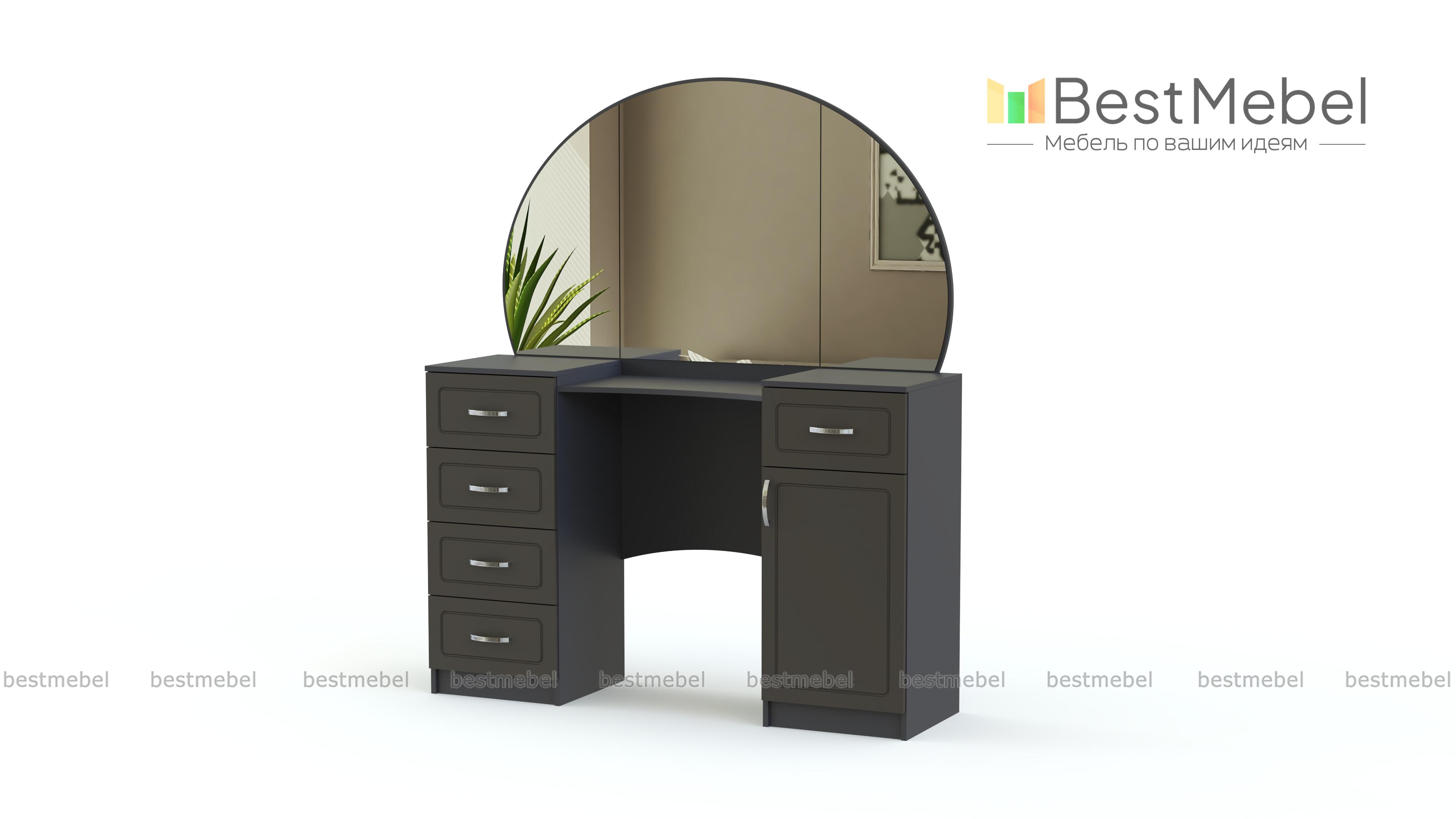 Стол туалетный Иво-5 BMS – элегантная модель для интерьера в классическом стиле. Столик оборудован эргономично вырезанной столешницей, большим овальным зеркалом и двумя тумбами – с выдвижными ящиками и распашным отделением для хранения разнообразных мелочей. Выполненные в насыщенных теплых тонах, фасады декорированы неброской фрезеровкой. Купить стол туалетный Иво-5 BMS и дополнить спальный гарнитур практичным предметом вам поможет наш интернет-магазин.