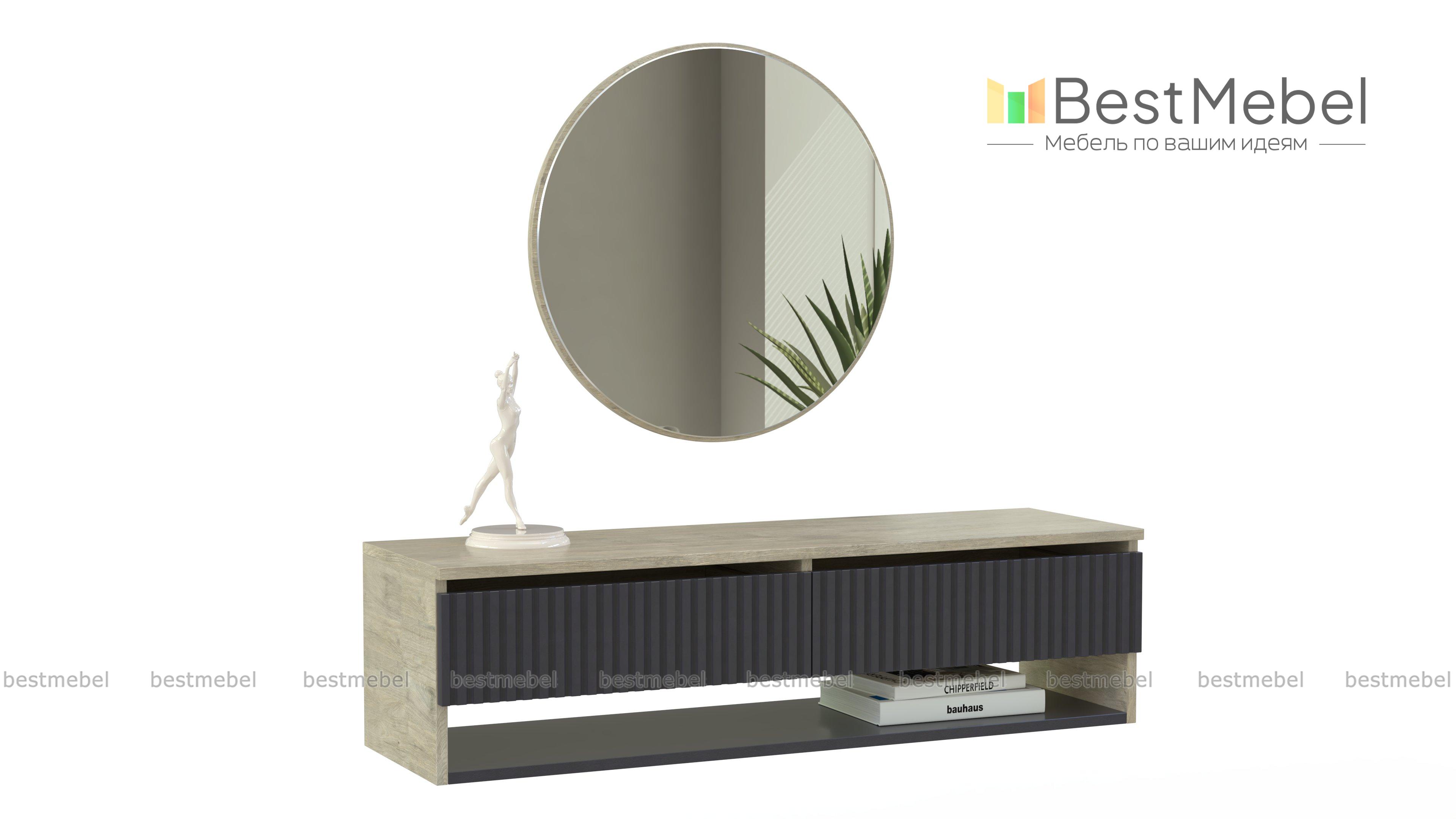 Туалетный столик Эдит 14 BMS с трендовой отделкой корпуса и фактурным фасадом имеет подвесную конструкцию. Два ящика и широкую открытую полку можно использовать для хранения любимой косметики, украшений и всевозможных аксессуаров, а на столешнице разместить стильный декор. Дополняет композицию большое круглое зеркало с узкой рамкой в тон корпусу. Купить туалетный столик Эдит 14 BMS и обустроить функциональную зону для ухода за собой вам всегда поможет наш интернет-магазин.