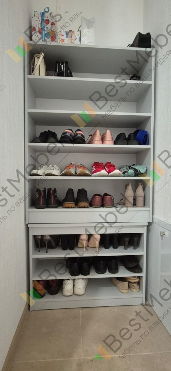 Покупали стеллаж и тумбу, чтобы собрать обувницу из них. На фото результат. Понравилось, что цена доступная, при этом внешний вид товара очень даже хороший. Доставка 4-5 дней, даже если под заказ по нашим размерам. Заранее согласовывают эскиз с вами, то есть вы уверены, что приедет тот товар, что вы и планировали. При сборке немного были сколы, но не критично и незаметно. Из минусов – стеллаж хотели повесить на стену, но крепления к стене очень тонкие у производителя и поэтому мы просто прикрепили к стене (верхний стеллаж), чтобы не упал. Сейчас ещё и комод заказали у БестМебель. Заказ №1091215