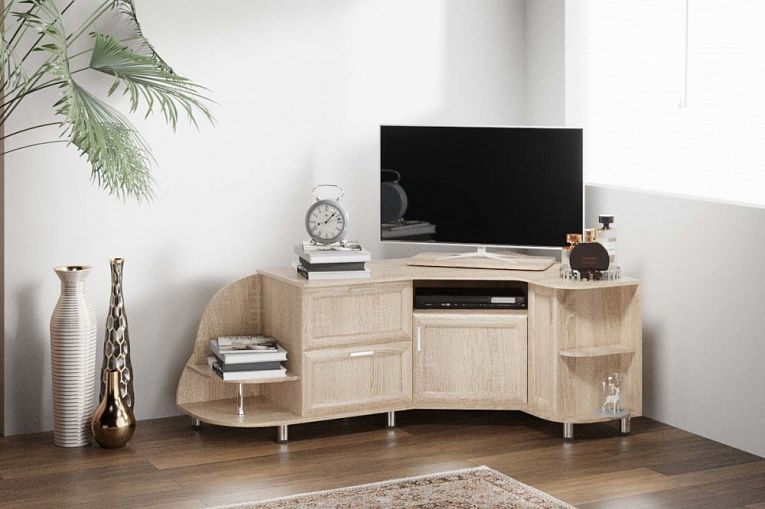 Тумба угловая под ТВ Мирона 7 BMS особенно вместительна благодаря практичной форме и позволяет сэкономить полезную площадь комнаты. Комбинированная модель с просторной столешницей оборудована нишей под аппаратуру, двумя распашными отделениями, ящиками для мелочей и открытыми радиусными полками. Рамочные фасады тумбы выполнены в древесных тонах, углы безопасно скруглены. Купить тумбу угловую под ТВ Мирона 7 BMS для интерьера гостиной приглашаем в наш интернет-магазин.