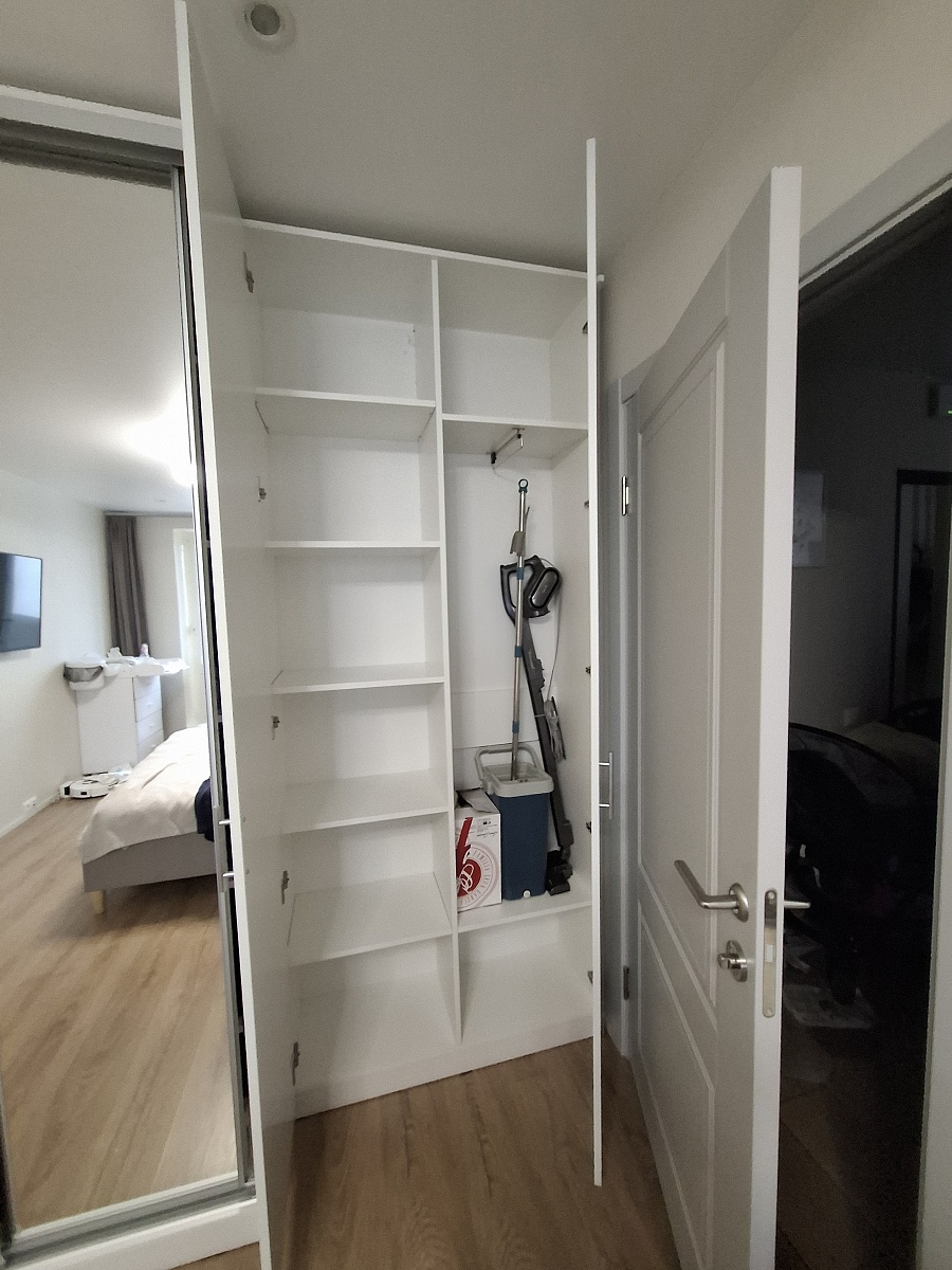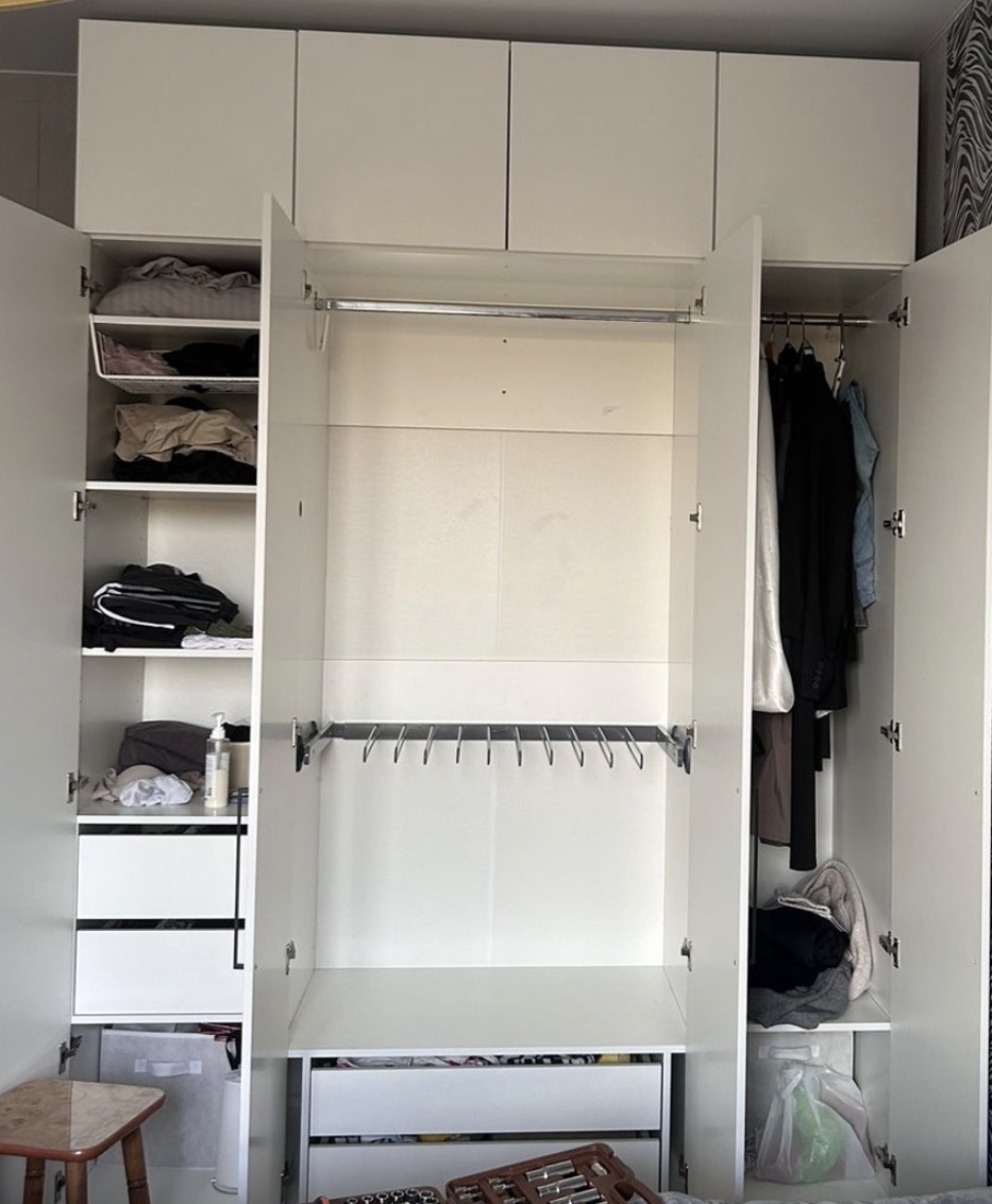 Шкаф покупали в прошлом году. Оформили в мебельном магазине лично. Мы внесли свои коррективы. Все ок. Когда доставили обнаружили, что положили разные ручки для дверей. Попросили заменить. Привезли на следующий день, но снова не такие. Решили уже забыть. (Брючницу на фото уже докупали сами)