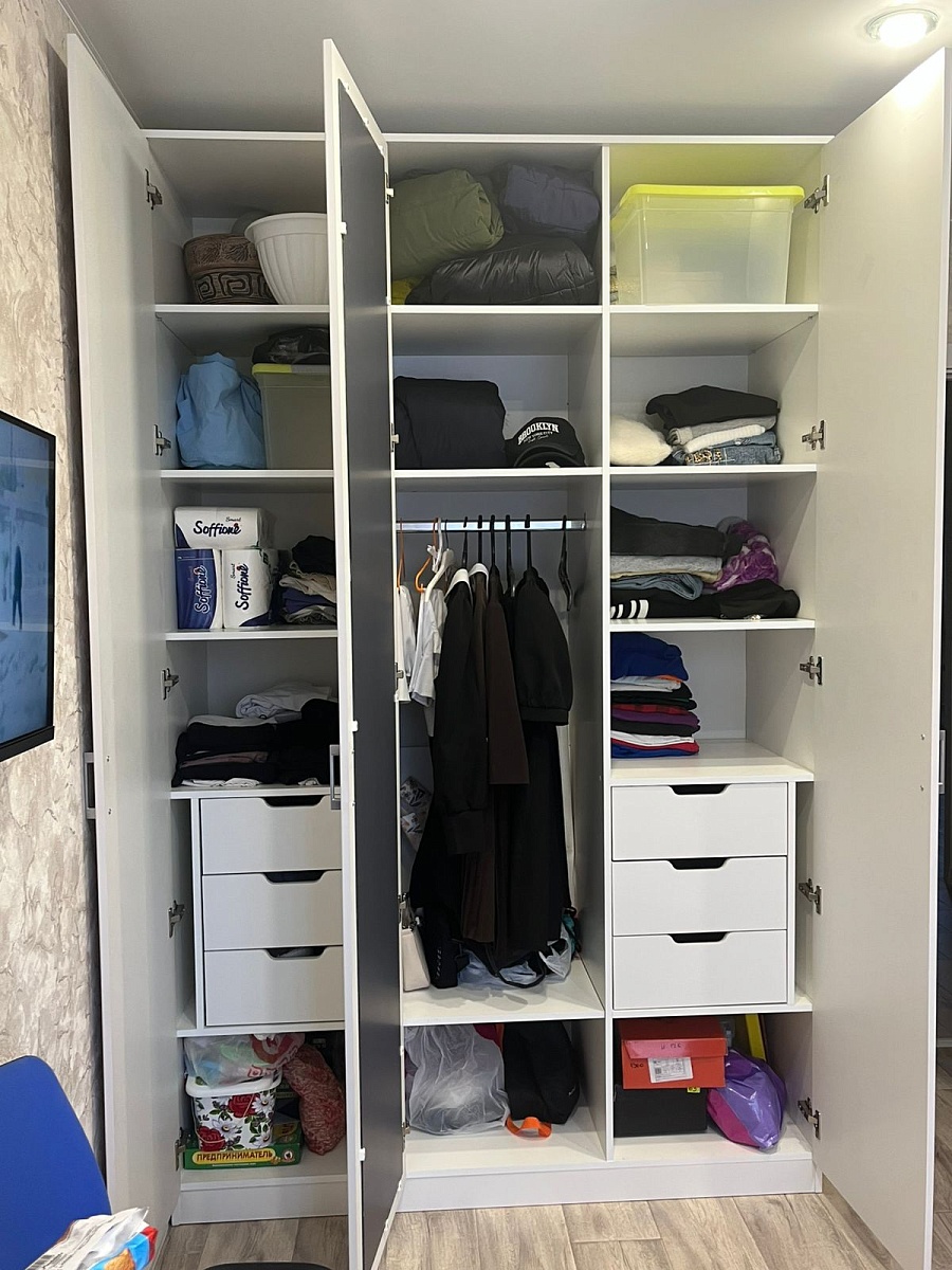 Всём добра! Приобрели данный шкаф. Вышла задержка с доставкой. Начал сомневаться в данной компании, но водитель развеял сомнения - сутки стоял с стуканувшим двиглом. И вот-шкаф. Никакого химозного запаха дешёвой плиты и клея. Отделка фасадов и стенок - на твёрдую пятёрку. Вот отсутствие инструкции по сборке-минусок, но согласен, шкаф сделан по индивидуальным параметрам. Мой респект конструкторам за возможность вертикальной сборки данной конструкции в ограниченной высоте. И сборка-добротная, как раньше, а не "три гвоздя и палка".Все детали подогнаны, крепёж рассчитан. Жена довольна. Рекомендую.