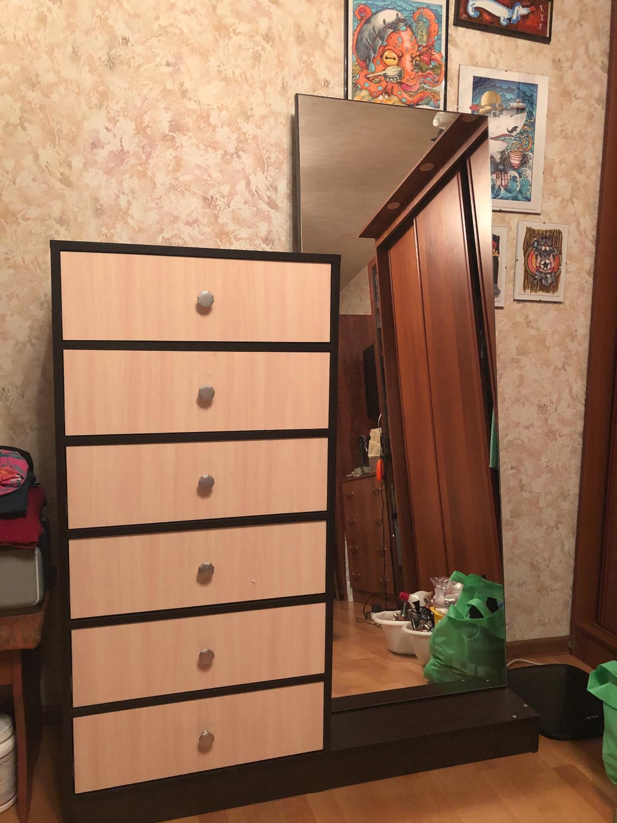 Давно засматривалась на этот комод. Очень переживала, что не будет видно ног, но зря, все видно, в полный рост даже если подойти почти впритык. По качеству, как и вся мебель данного бренда, могло быть и лучше. Зеркало стационарное, угол наклона не меняет, пожалуй самое хлипкое место в конструкции. Если заходите двигать с мета на место обязательно усиливайте конструкцию. Сам комод очень вместительный, 6 ящиков. Фурнитура нормальная.