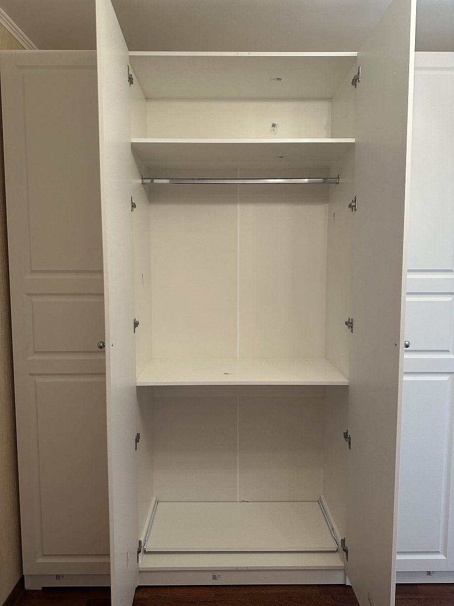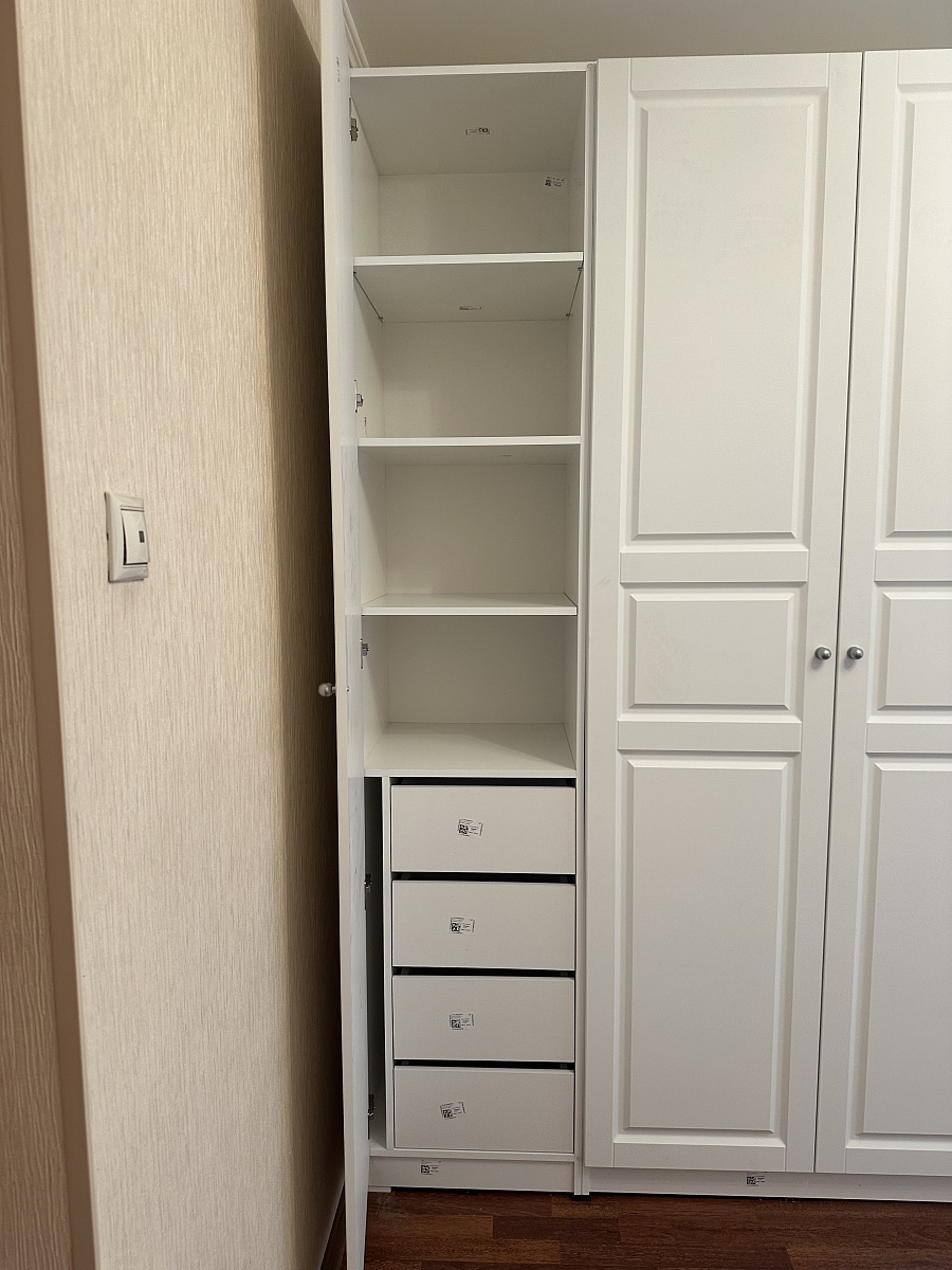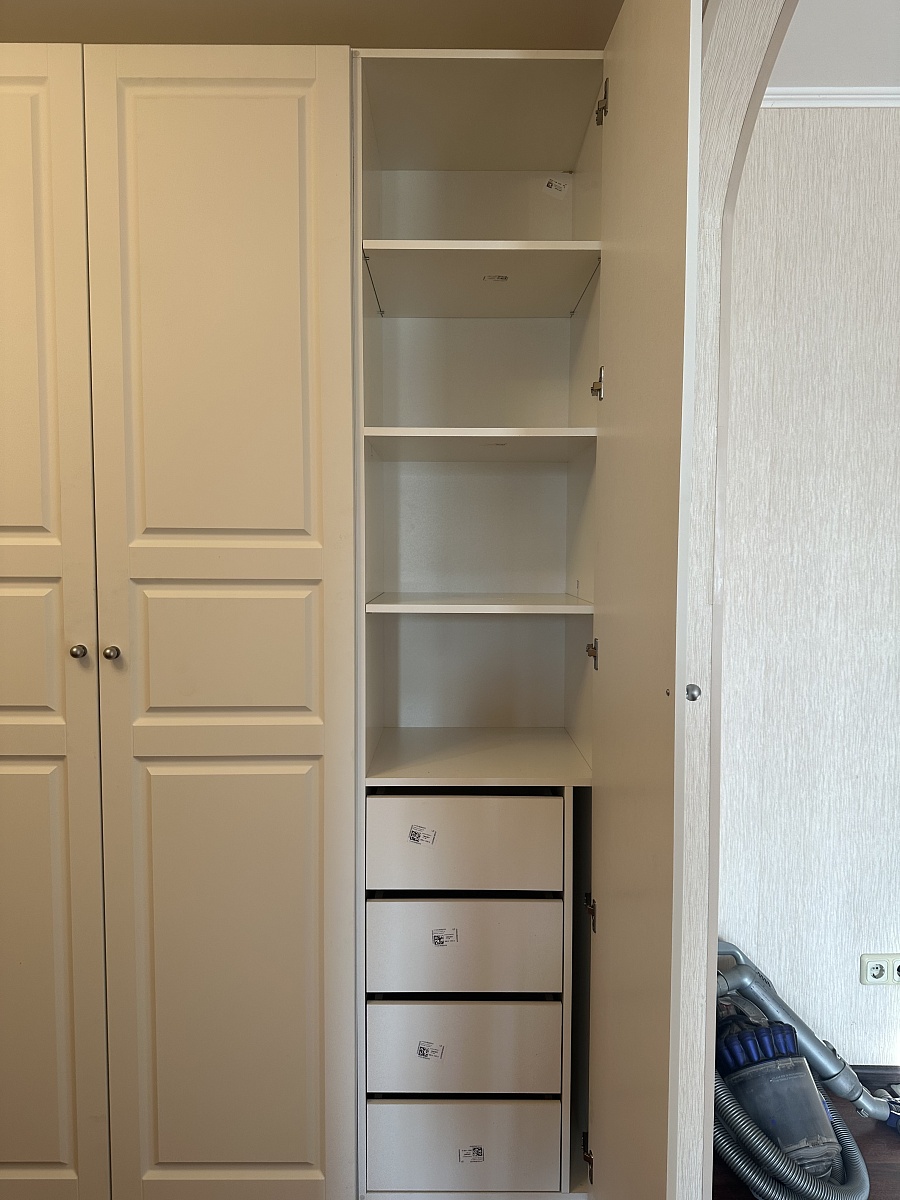 Заказ 00000989902. Шкаф "Остин Нео 16 BMS" мы брали в спальню, чтобы навести порядок с одеждой. Первое, что понравилось – возможность выбрать цвет. Взяли серый – смотрится очень стильно и современно, именно такой нейтральный, но не скучный оттенок, который мы искали. Черные ручки стали отличным контрастным акцентом, завершили вид. Сам дизайн действительно минималистичный и аккуратный, не перегружает пространство.Функционально шкаф оказался удобным. Три двери – хороший размах. Отделение для вешалок вместило все платья и костюмы, полки отлично подошли для футболок, свитеров и постельного белья. Распашная антресоль вверху – спасение для чемоданов и сезонных вещей, которые не нужны каждый день. Зеркало на центральной дверце – просто бомба! Очень удобно видеть себя в полный рост перед выходом, не бегая по квартире. И правда создает ощущение, что комната чуть больше.Но сборка... Сборка была испытанием.Деталей много, и самое сложное – установить вертикальные стенки (боковины и центральную перегородку) в одиночку. Это просто нереально. Они большие, тяжелые, их нужно держать строго вертикально и одновременно прикручивать. Без помощника тут никак, мы еле справились вдвоем. Еще один момент – петли. Их несколько типов (для обычных дверей и для зеркальной), и в инструкции не сразу понятно, какие куда. Пришлось искать видео сборки в интернете, чтобы разобраться – без него наверняка перепутали бы. Будьте готовы к этому этапу.Если вам нужен компактный, но вместительный шкаф с современным дизайном и полным зеркалом, и вы готовы к сборке (обязательно с помощником и, возможно, с обучающим видео под рукой), то "Остин Нео" – отличный вариант. Смотрится дороже своей цены, и теперь вся одежда наконец-то прибрана!